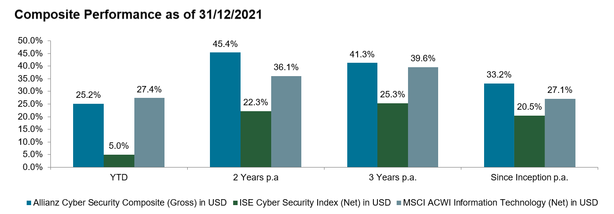Source: Allianz Global Investors, as of 31 December 2021. Data gross of fees. This shows the performance of the master fund, so it is not complied to AIMC’s standard. The information above is a composite performance under the same strategy. KFCYBER will invest in Allianz Global Investors Fund - Allianz Cyber Security, Class RT (USD) which is registered in Luxembourg and incepted on 9 February 2021