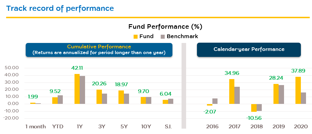 - Aim to generate superior financial returns through investments that contribute to positive social and environmental outcomes backed with an outstanding track record of performance compared with benchmark.