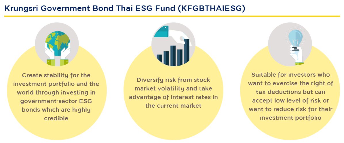 KFGBTHAIESG allows you to claim tax deduction through investing in ESG Government Bond instruments that focus on sustainability with lower risk and help reduce volatility in the overall portfolio in order to offer investors an opportunity to achieve sustainable returns and promote social developments and environmental conservation in parallel.