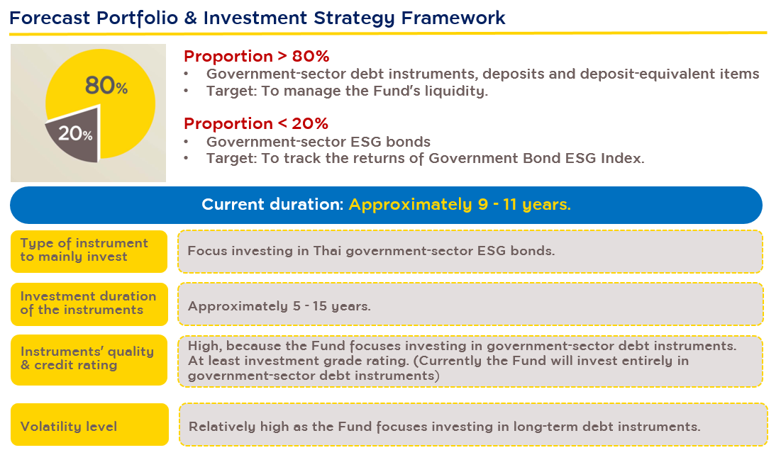 - The risk arises from investing mainly in government bonds, bonds with principal and interest guaranteed by the Ministry of Finance or debentures with principal and interest guaranteed by the Ministry of Finance but not including convertible debentures, that are green bonds, sustainability bonds or sustainability-linked bonds, which causes the fund to lose the opportunity to invest in general debt instruments that may offer better returns.