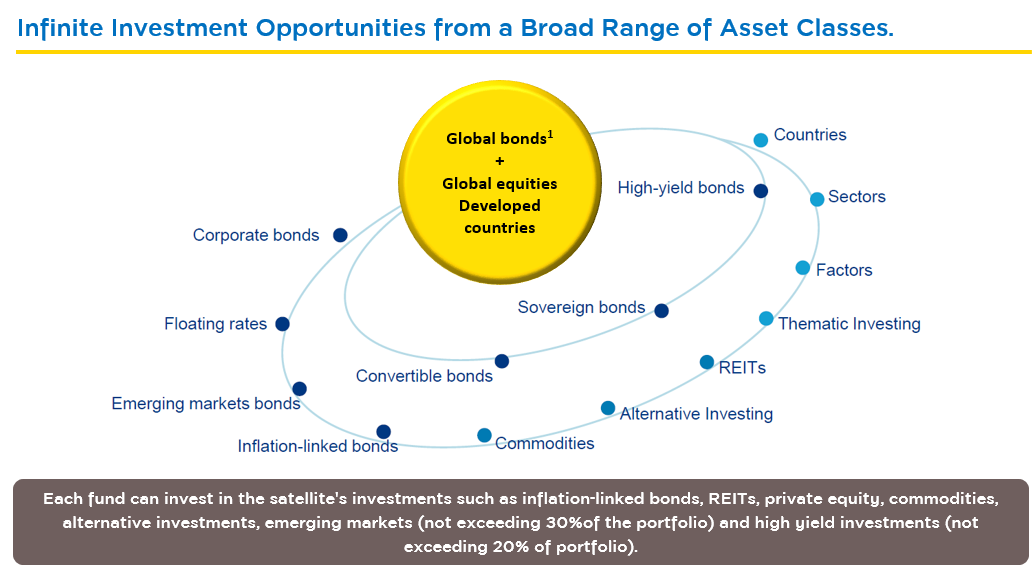 1. A flexible investment universe comprising a broad range of global asset classes to make the best of every investment opportunity with a highly flexible portfolio, which is divided into core portfolio and satellite portfolio.