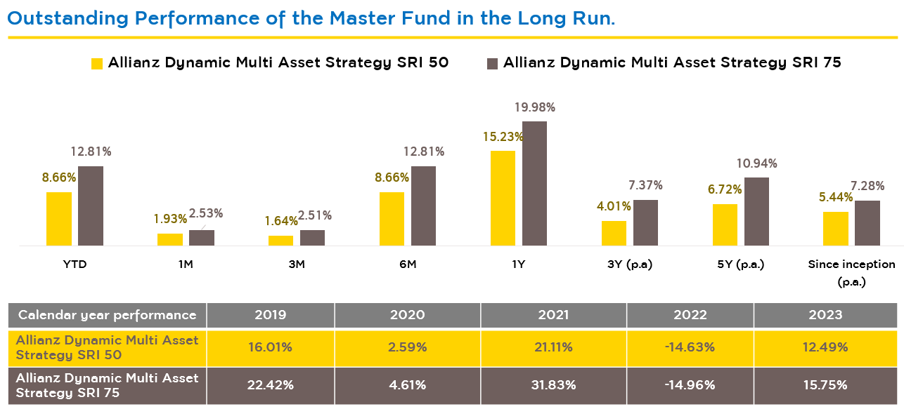Source: Allianz Global Investors as of May '24• | It does not guarantee the returns arisen from this investment strategy, which may cause investors a loss. A team of fund managers will perform the annual reviews of investment ratio and volatility range. *The percentage of stocks in the investment portfolio of Allianz Dynamic Multi Asset Strategy SRI 75 may increase up to 125% using derivative instruments. • The performance shown is the performance of the Master Fund which is not in accordance with the mutual fund performance measurement standard prescribed by the Association of Investment Management Companies (AIMC).