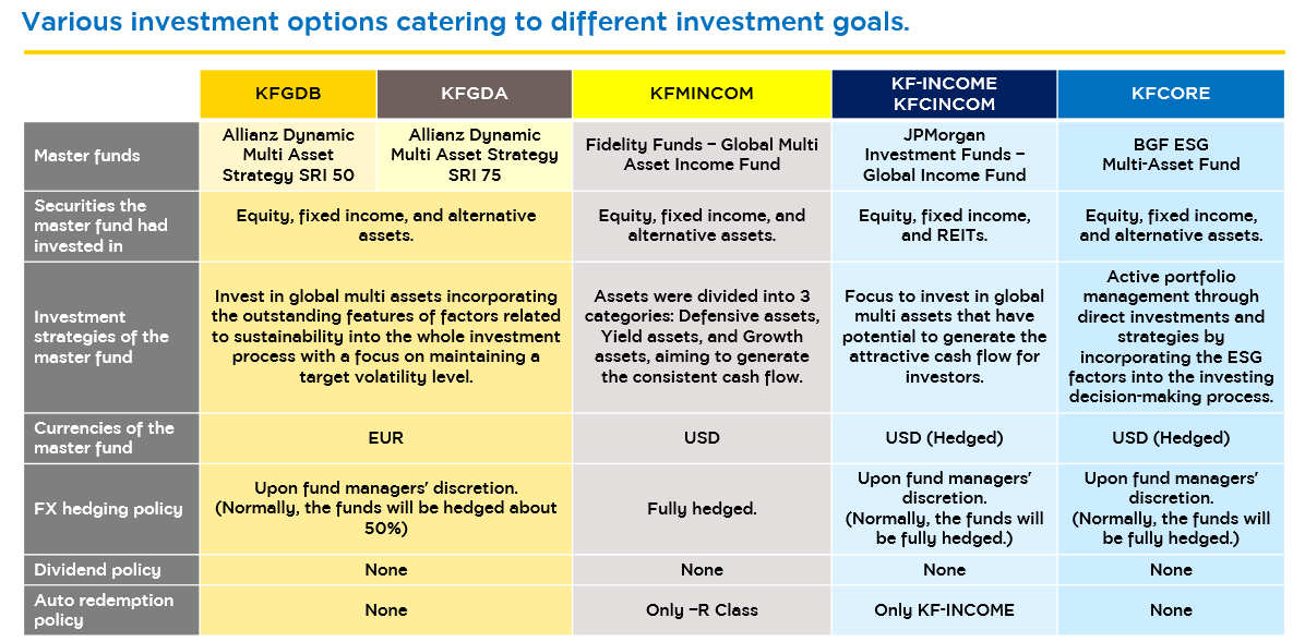 Source: Master Funds as of 31 Jul. '24 | KF-INCOME, KFCINCOM, KFCORE, KFGDB, and KFGDA are hedged against foreign exchange risk upon the fund managers' discretion. Thus, they are subject to a foreign exchange risk which may cause investors to lose money or gain from foreign exchange fluctuation/ or receive a lower return than the initial investment amount.
