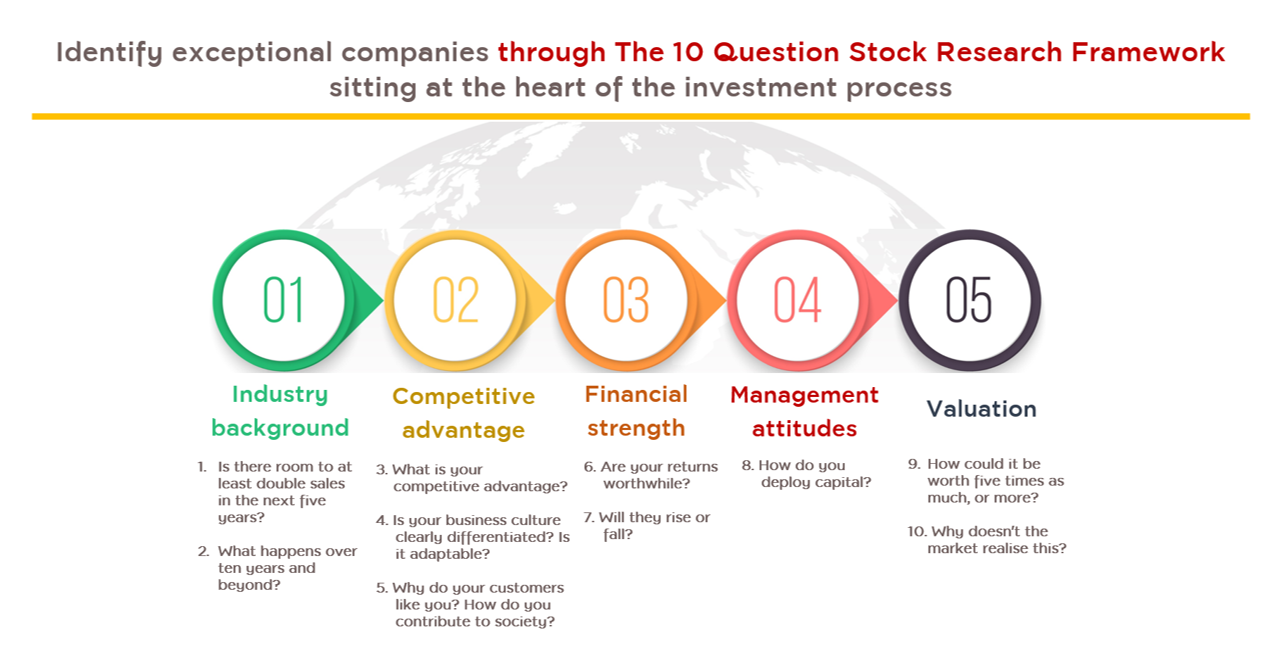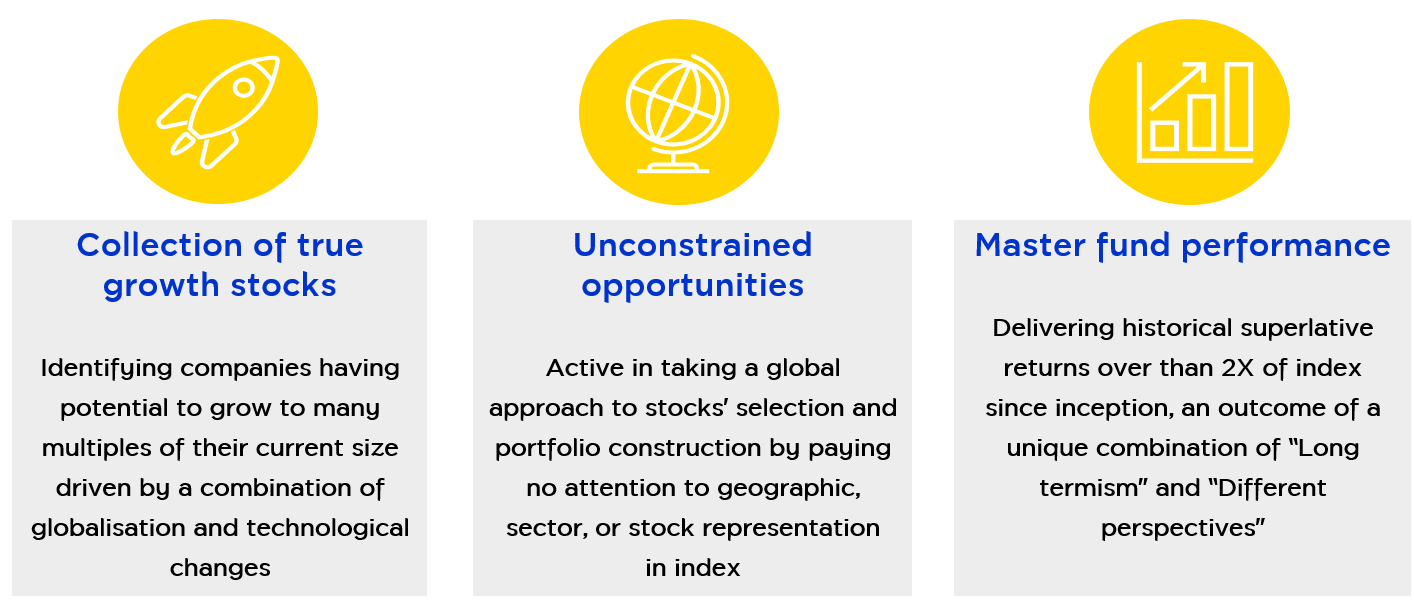 - Focus on a small number of holdings with potentials in which the fund has confidence and that will drive the long-term returns through identifying the exceptional companies based on an analysis of growth potentials that will drive the next decade of returns.
