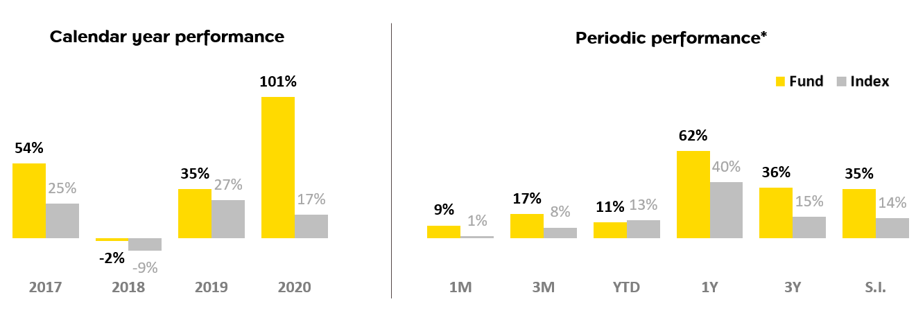 Source: Baillie Gifford as of 30 June 2021 | US dollars. Net of fees | Index: MSCI ACWI Index | Share Class Inception date: 10 August 2016 | This shows the performance of the master fund, so it is not complied to AIMC’s standard.