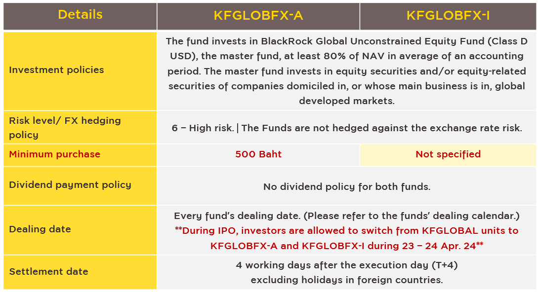During IPO, investors can switch from KFGLOBAL units to KFGLOBFX-A and KFGLOBFX-I during 23 - 24 April 2024.