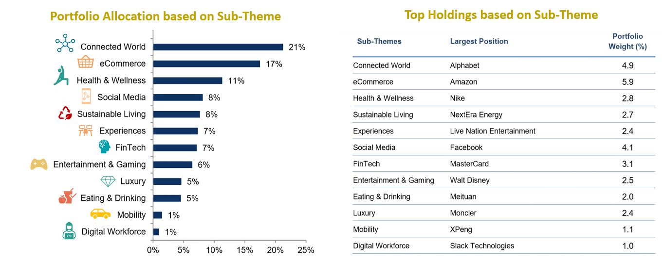 Source: Goldman Sachs Asset Management, FactSet, as of 30-Jun-2021. The theme chart might not total to 100% due to weight of cash in the portfolio. For illustrative purposes only. Portfolio holdings and/or allocations shown above are as of the date indicated and may not be representative of future investments. The holdings and/or allocations shown may not represent all of the portfolio's investments. Future investments may or may not be profitable.