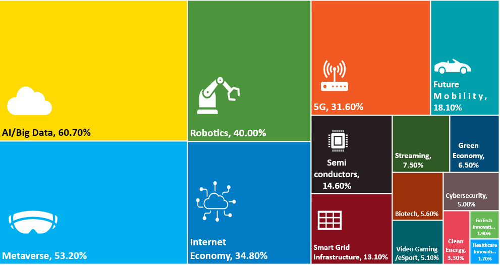 3. High growth potential of the index thanks to the innovation developments of tech companies in the Nasdaq-100. These companies spend nearly twice as much in R&D, on average, compared to those in the S&P 500 with 10.1%1 weighted average R&D as sales, contributing to investment opportunities and business profitability when there are users these innovations, such as ChatGPT from OpenAI that has become the world’s fastest-growing app ever, reaching 100 million users2. And it’s anticipated that global AI market share will grow at a CAGR of 19% in 20263.