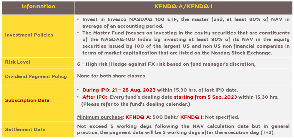 Investing through Invesco NASDAQ 100 ETF (Master Fund) whose portfolio was allocated into the largest 100 companies trading on the Nasdaq stock market where technology and innovation sectors have represented about 50% of the index weight, including global Big Tech names, such as Alphabet, Amazon, Apple, Meta, Microsoft, Nvidia, and Tesla, KFNDQ will benefit from the master fund’s high liquidity and competitive fee charge, which will help increase the opportunity to generate returns closely replicating the Nasdaq-100 index performance.