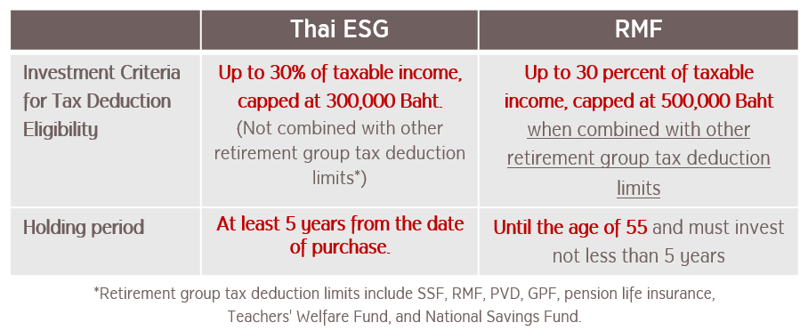 - RMF is the fund promoting long-term investment for retirement. | Thai ESG Fund aims to promote long-term savings and encourage Thailand’s sustainable investment.