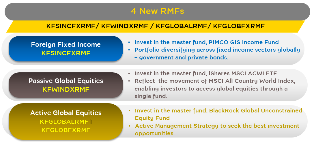 Krungsri Asset Management is offering 4 new RMFs accessing the global investment portfolios, from which investors can have a wide range of investment products to choose. These four new funds represent the three foreign investing themes: fixed income, world index, and leading equities.