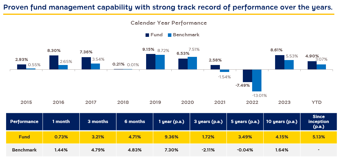 Source: PIMCO as of 31Aug’24. | Benchmark: Bloomberg US Aggregate Index. The Fund’s inception date is 30 Nov 2012. The performance shown is the performance of the Master Fund net of management fee and is denominated in USD. The performance shown is the performance of the Master Fund which is not in accordance with the standards on mutual fund performance measurement as prescribed by AIMC.