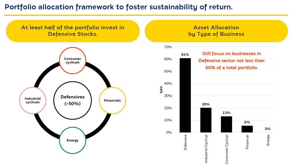 - Allocating the balanced portfolio to foster sustainability of return: More than 50% of a total portfolio being invested in defensive stocks, while the remaining investment portion will be diversified among various types of businesses having high potential to generate excessive returns such as financials, energy, industrials, and consumption.