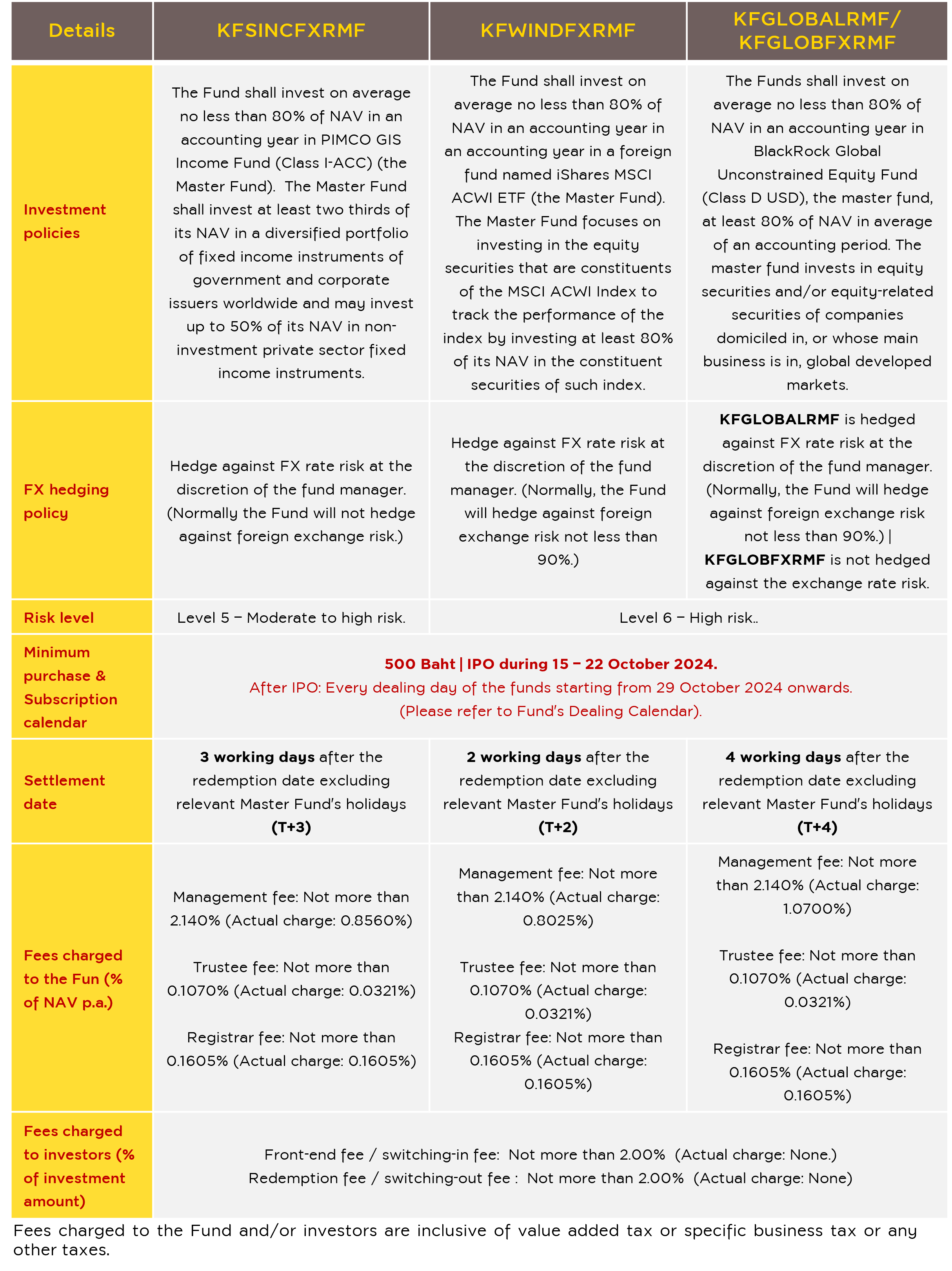 - For KFSINCFXRMF, KFWINDXRMF, and KFGLOBALRMF, they are hedged against a foreign exchange risk upon the discretion of fund managers. Thus, they are subject to a foreign exchange risk which may cause investors to lose money or gain from foreign exchange fluctuation/ or receive a lower return than the initial investment amount.