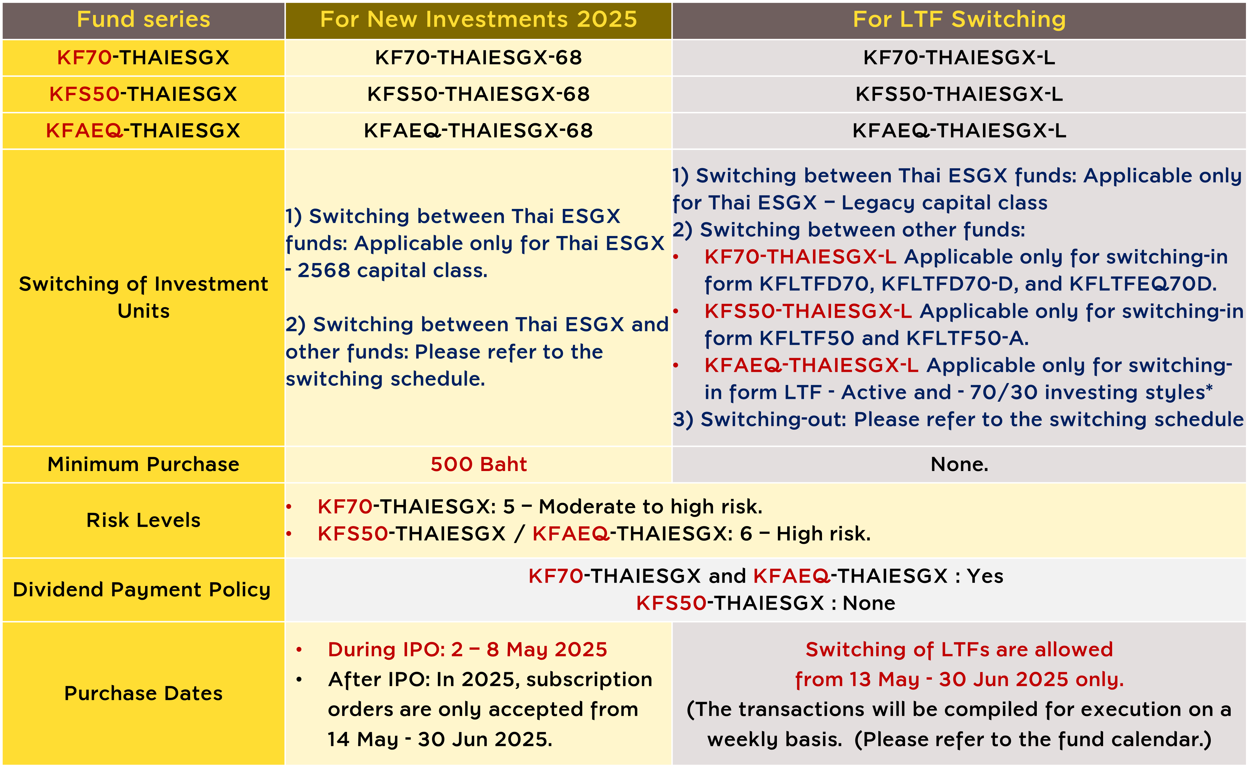 - KFS50-THAIESGX-68 : For new investment / 2025 tax deduction.