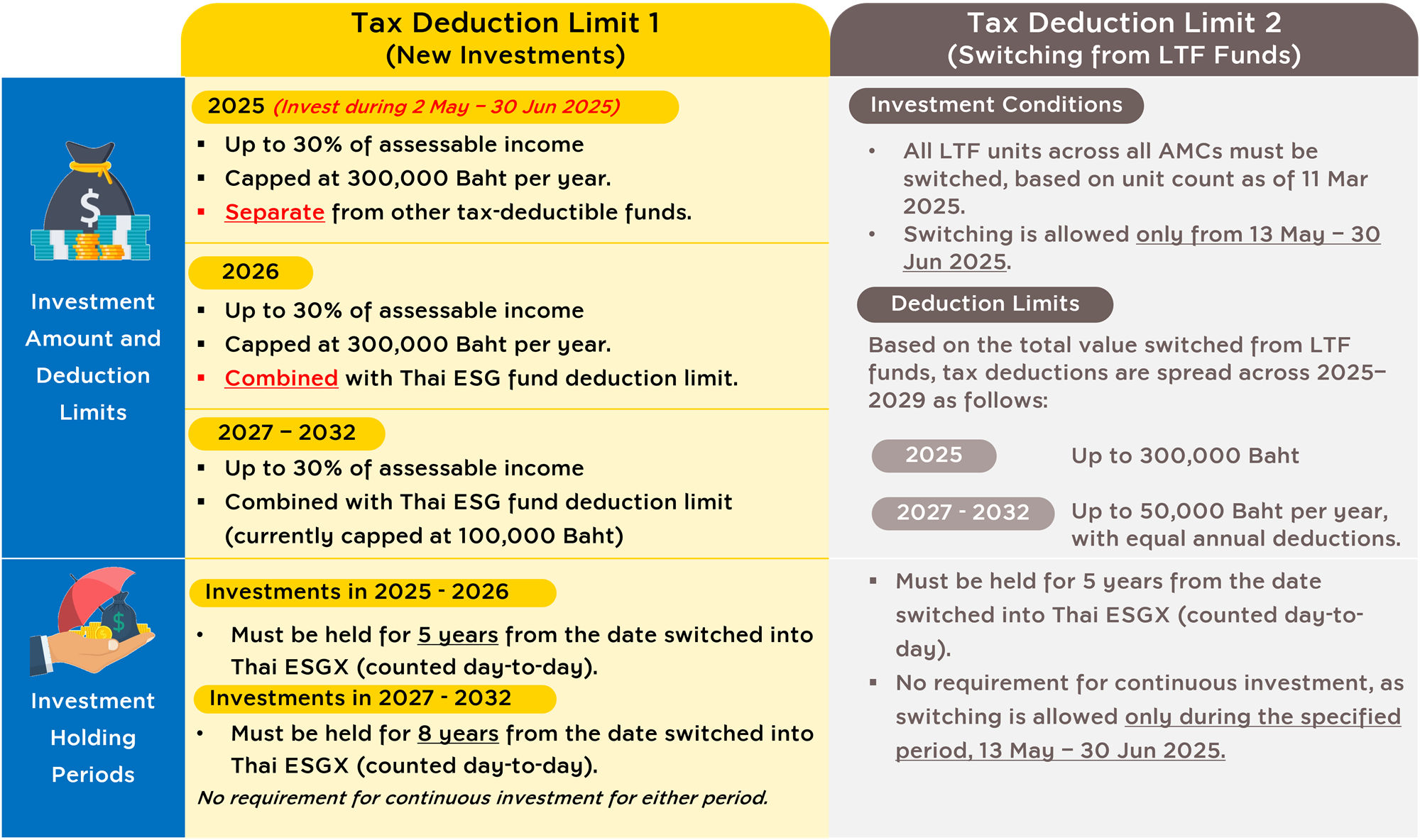 - Limit 2: Switch LTF for a deduction up to 500,000 Baht (300,000 for 2025; 50,000 Baht per year on average for 2026 - 2029).