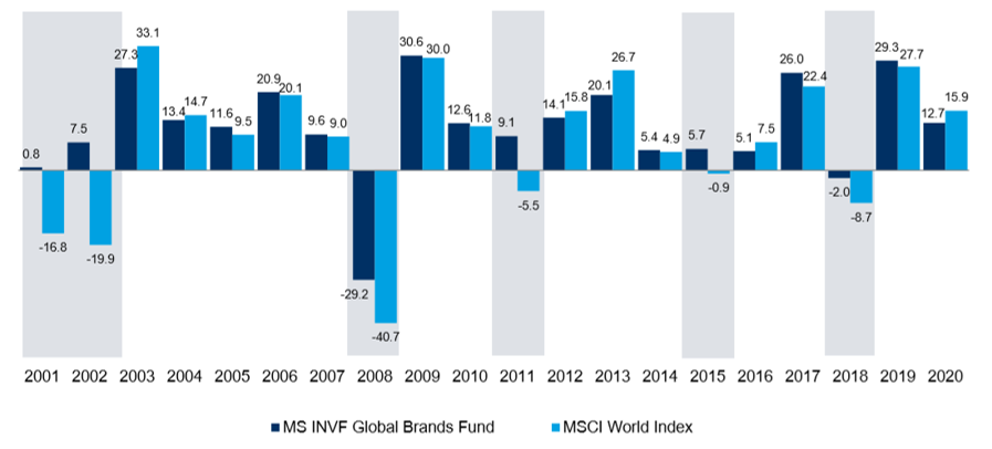 Source: Morgan Stanley Investment Management Limited as of 31 Dec. 2020. | The performance shown belongs to Morgan Stanley Investment Funds - Global Brands Fund, I share class which is the oldest share class incepted on 30 Oct. 2000, while KFGBRANSSF and KFGBRANRMF will invest in ZX and Z share classes incepted on 22 Feb. 2010 and 10 Jun. 2008 . The performance is presented net of investment management fees and are quoted in USD terms. This shows the performance of the master fund, so it is not complied to AIMC's standards.