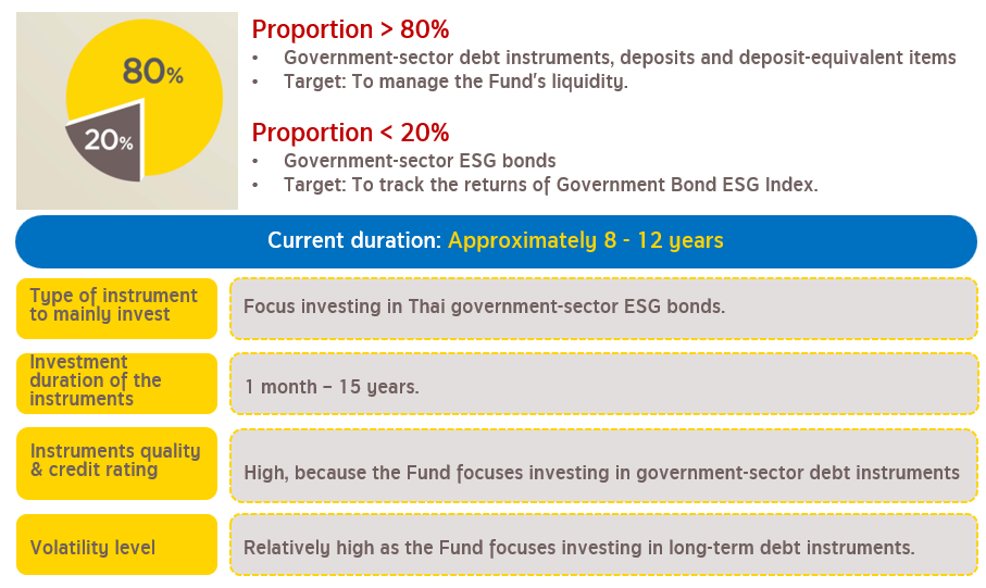 - The risk arises from investing mainly in government bonds, bonds with principal and interest guaranteed by the Ministry of Finance or debentures with principal and interest guaranteed by the Ministry of Finance but not including convertible debentures, that are green bonds, sustainability bonds or sustainability-linked bonds, which causes the fund to lose the opportunity to invest in general debt instruments that may offer better returns.