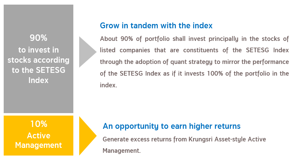 - Aims to deliver returns beyond the benchmark through an active strategy: About 90% of the portfolio mirrors the SETESG Index via quantitative strategy. The remaining 10% follows Krungsri’s active management approach to enhance return potential. (Source: Krungsri Asset Management, Oct 2025)