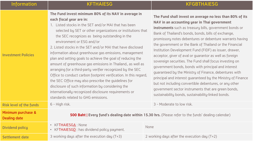- KFTHAIESG offers two share classes: KFTHAIESGA (Accumulation class - No dividend payment) and KFTHAIESGD (Dividend paying unit).