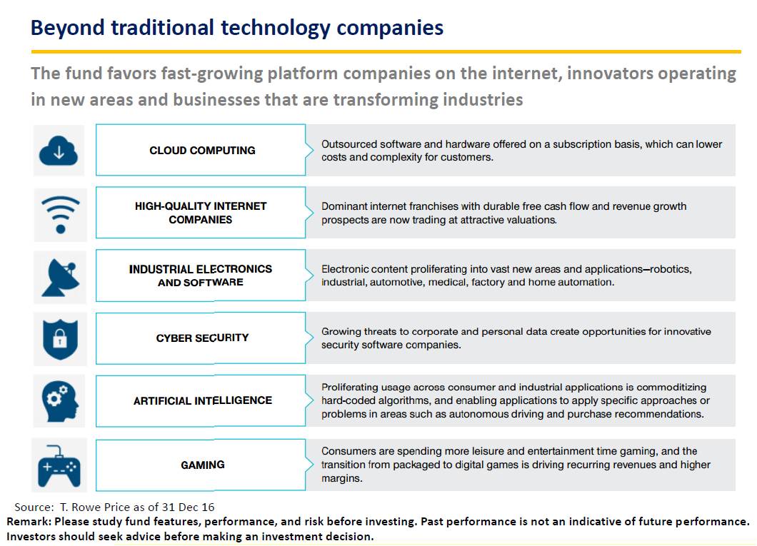 Mr Goh, T.Row Price Funds' executive, explained that the fund looks to invest in three types of technology companies. Among them, the first is fast-growth stocks such as Google, Netflix and Priceline; the second is innovation stocks like Amazon and Alibaba with their expansion into cloud computing technology. The third is companies with capabilities to transform the industry in the future like an electric car maker Tesla. Besides, companies with outperformance in returns, those which tend to be monopolize the industry and are likely to be the winner in the industry will also be investment targets. The fund emphasizes on technology firms with high growth potential around the world. Currently, it has 39 super stocks in its investment portfolio. About 31% of total are stocks of companies outside the United States.