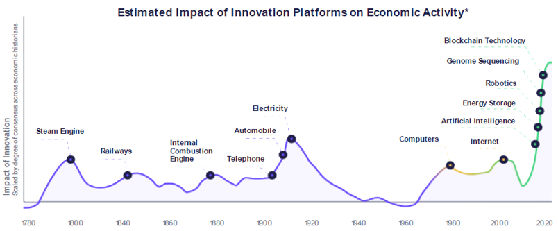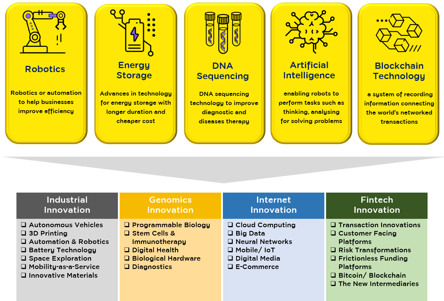 ARK Investment has divided disruptive innovation categories into four key themes 1) Industrial Innovation, 2) Next Generation Internet, 3) Genomic Sequencing and 4) Fintech. The fund thus focuses on making investment in businesses that involved in these thematic innovations, while these invested businesses will be supported by five major technology platforms extending from use of Robotics, advances in Energy Storage, DNA Sequencing technologies, Artificial Intelligence, and Blockchain Technology.