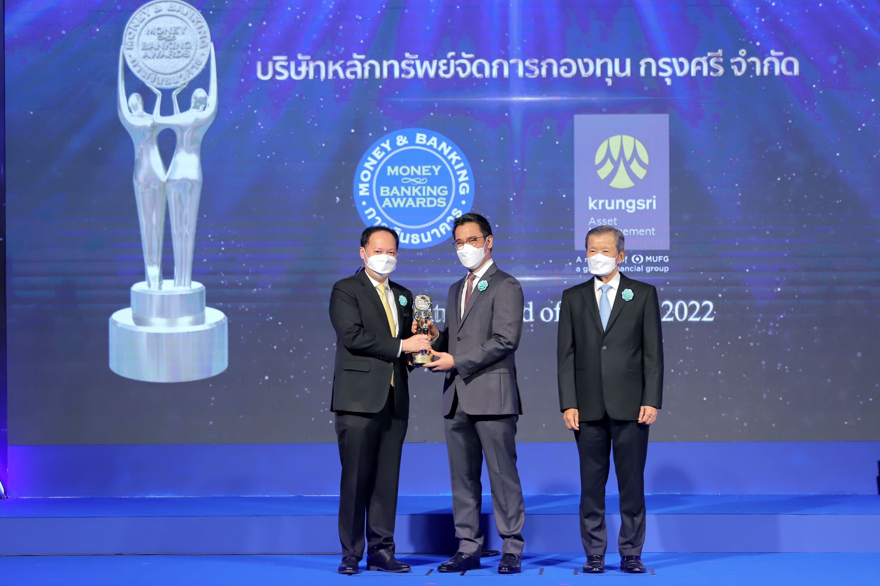 Krungsri Asset Management Company Limited led by Mr. Sira Klongvicha, Chief Investment Officer (1st left) received the Best Mutual Funds of the Year 2022 award for Krungsri Cash RMF (KFCASHRMF) from Dr. Sethaput Suthiwartnarueput, Governor, Bank of Thailand, at Money & Banking Awards ceremony.
