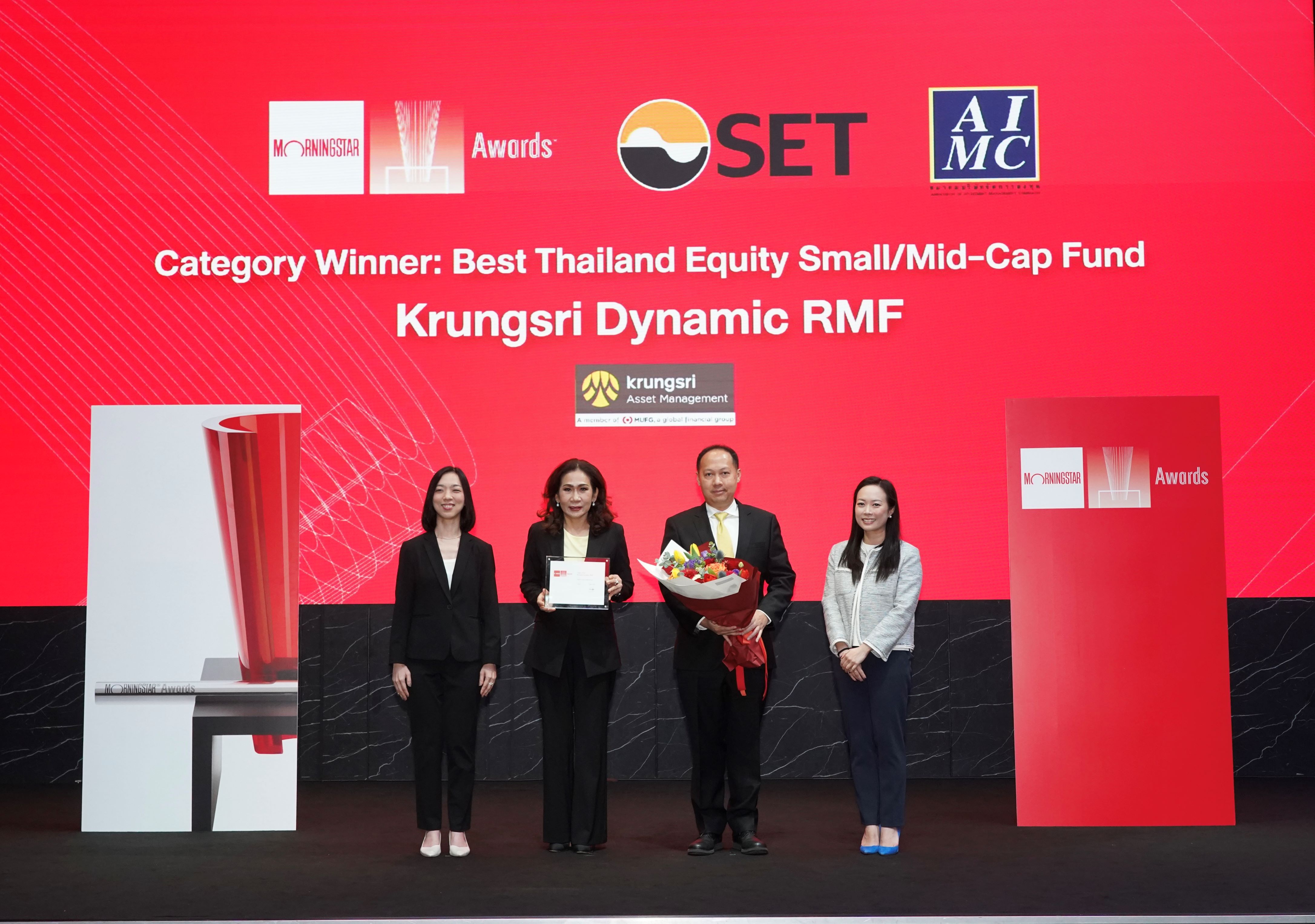 Krungsri Asset Management Company Limited has been honored with the award at the Morningstar Awards for Investing Excellence 2025 ceremony, organized by Morningstar Research (Thailand), where Mrs. Supaporn Leenabanchong, Managing Director, along with key executives including Mr. Sira Klongvicha, Chief Investment Officer; Mr. Wiput Uaanant, Deputy Chief Investment Officer; and Mr. Thalit Choktippattana, Chief Equity Investment Officer, had receive the award for Krungsri Dynamic Equity RMF (KFDNMRMF) in the Best Thailand Equity Small/Mid-Cap category.