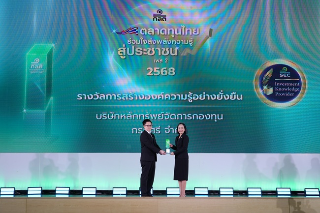 Mr. Wiput Uaanant, Deputy Chief Investment Officer, Krungsri Asset Management Company Limited, received the “Sustainability Award” under the project “Thai Capital Market Unites to Empower Financial Knowledge – Phase 2 (2025)”, organized by the Securities and Exchange Commission (SEC). The award was presented by Associate Professor Dr. Pornanong Budsaratragoon, Secretary-General of the SEC. Krungsri Asset Management received this award for the second consecutive year, in recognition of its ongoing initiative to promote financial and investment literacy through the “First Step into Mutual Funds” program, which has been consistently disseminated via social media channels throughout the year.
