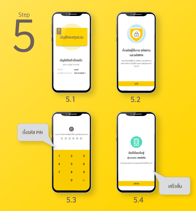 5. หลังจากกรอกข้อมูลเปิดบัญชีกองทุน กดยืนยันข้อมูล ตั้งรหัสผู้ใช้ รหัสผ่าน และ PIN เพื่อเริ่มใช้งาน Mobile App ได้ทันที