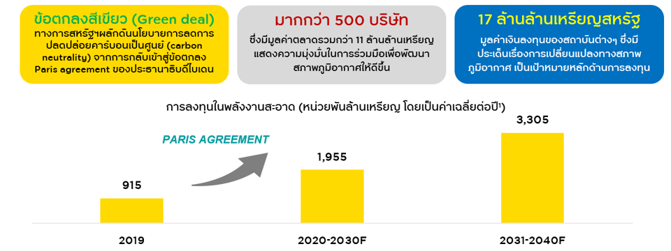 คุณ Tim กล่าวว่า จากการออกกฎเกณฑ์และข้อบังคับเชิงนโยบายของทางภาครัฐที่พร้อมทุ่มงบประมาณการลงทุนด้านต่างๆ จึงเป็นโอกาสที่น่าสนใจมากสำหรับการลงทุน เนื่องจากจะมีเม็ดเงินงบประมาณไหลเข้าไปในภาคธุรกิจที่เกี่ยวข้องเพิ่มมากขึ้น มีการคาดการณ์ว่างบประมาณที่จะจัดสรรสำหรับการลงทุน โดยเฉพาะอย่างยิ่งด้านพลังงานสะอาดจะเพิ่มขึ้นจาก 9 แสนล้านเหรียญในปี 2019 เป็นกว่า 3 ล้านล้านเหรียญในระหว่างปี 2030 - 2040 ส่วนในภูมิภาคยุโรปก็มีการจัดสรรงบประมาณสูงถึง 1 ล้านล้านยูโรเพื่อผลักดันการดำเนินนโยบายพัฒนาสิ่งแวดล้อม