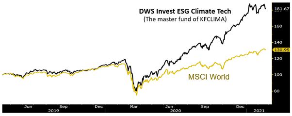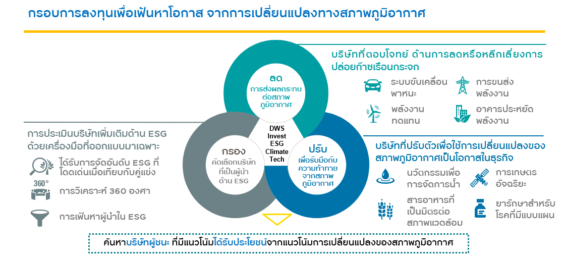 ในช่วง 2-3 ปีทีผ่านมา ความมุ่งมั่นในการลดภาวะโลกร้อนได้ส่งผลดีต่อกลุ่มธุรกิจที่มีเทคโนโลยีและนวัตกรรมด้านสิ่งแวดล้อมมาแล้วอย่างต่อเนื่อง โดยเฉพาะบริษัทที่มีเทคโนโลยีในการช่วยลดการปล่อยก๊าซคาร์บอนไดออกไซด์ และธุรกิจที่ได้ประโยชน์จากการเปลี่ยนแปลงภูมิอากาศ ล้วนมีอัตราการเติบโตระดับตัวเลขสองหลัก* เช่น ธุรกิจการผลิตไฟฟ้าด้วยพลังงานสะอาด พลังงานทางเลือก พลังงานแสงอาทิตย์ พลังงานน้ำ พลังงานลมมีอัตราการเติบโตเฉลี่ยปีละ 27% ภาคธุรกิจการขนส่ง เช่น รถยนต์ไฟฟ้า ยานพาหนะแบบไฮบริด เติบโตเฉลี่ย 22% ภาคการเกษตร ปศุสัตว์ เติบโตเฉลี่ย 16% และที่เกี่ยวข้องกับภาคอสังหาริมทรัพย์เช่นวัสดุฉนวน ระบบทำความร้อน ระบบระบายอากาศก็มีการเติบโตเฉลี่ยปีละ 11% (*ที่มา: International Energy Agency (ปี 2563), Bloomberg Finance L.P., DWS Investment GmbH ณ พ.ย. 63 | ตัวเลขประมาณการของนักวิเคราะห์และคาดการณ์ต่างๆไม่ได้เป็นสิ่งยืนยันถึงผลตอบแทนในอนาคต | ข้อมูลคาดการณ์อ้างอิงจากสมมติฐาน ประมาณการ ความคิดเห็น และแบบจำลอง ซึ่งอาจคลาดเคลื่อนหรือไม่ถูกต้อง)