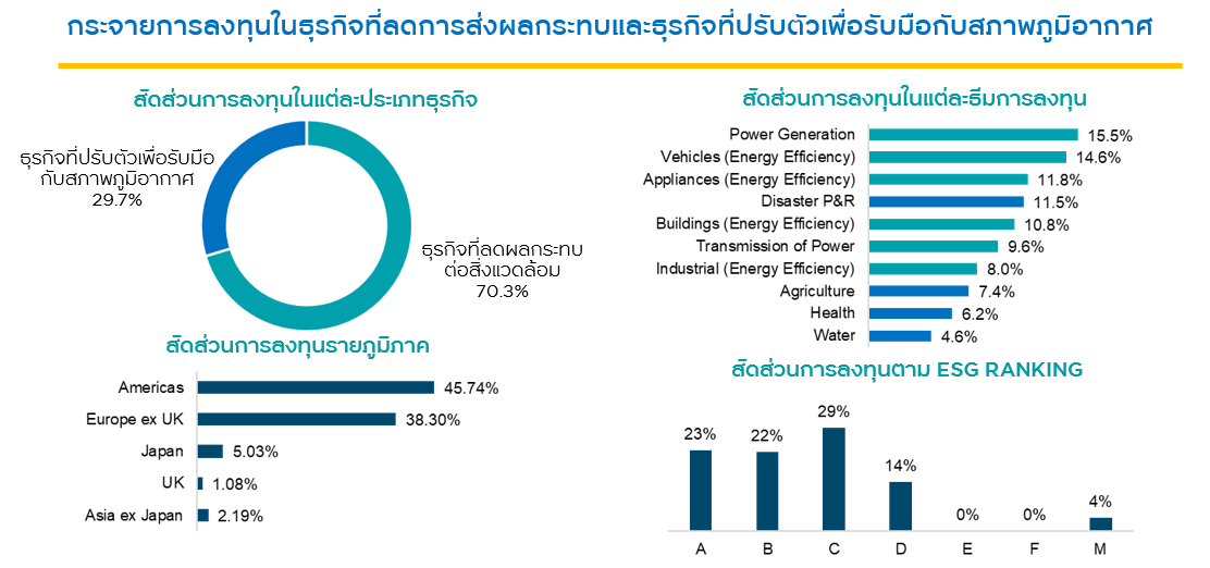 สำหรับกองทุนหลัก DWS Invest ESG Climate Tech ที่บลจ.กรุงศรี คัดเลือกมาเป็นกองทุนที่มีการกระจายความเสี่ยงได้อย่างเหมาะสม โดยพอร์ตของกองทุนมีการกระจายลงทุนอยู่ใน 50 - 80 บริษัท ทั้งขนาดใหญ่ กลางและเล็ก ที่คัดเลือกมาแล้วจากทั่วโลก และกลั่นกรองให้เหลือบริษัทที่ดีที่สุดในอุตสาหกรรม โดยบริษัทที่คัดเลือกมาต้องสอดรับกับ 2 แนวทางการลงทุนของกองทุน ได้แก่ บริษัทที่นำเสนอผลิตภัณฑ์หรือบริการที่สามารถตอบโจทย์เรื่องการลดผลกระทบต่อสิ่งแวดล้อมและใช้พลังงานอย่างมีประสิทธิภาพ เช่น พลังงานทดแทน พลังงานสะอาด รถยนต์ไฟฟ้า อาคารประหยัดพลังงาน กลุ่มนี้จะมีสัดส่วนการลงทุนอยู่ 70% และอีก 30% เป็นการลงทุนในธุรกิจที่ปรับตัวเพื่อรับมือกับสภาพภูมิอากาศ เช่น นวัตกรรมการจัดการน้ำ การเกษตรอัจฉริยะ สารอาหารที่เป็นมิตรต่อสิ่งแวดล้อม ทั้งนี้ ทุกบริษัทต้องเข้าหลักเกณฑ์ด้าน ESG มีฐานะการเงินที่แข็งแกร่ง มีโอกาสเป็นผู้ชนะในอุตสาหกรรมที่ได้รับประโยชน์จากการเปลี่ยนแปลงทางภูมิอากาศ นอกจากนี้ กองทุนยังคำนึงถึงเรื่องการสร้างความเติบโตของพอร์ตควบคู่ไปกับการกระจายความเสี่ยง โดยมีการลงทุนทั้งในหุ้นที่เป็นกลุ่มที่เติบโตตามวัฏจักรของเศรษฐกิจ เช่น กลุ่มอุตสาหกรรม IT และวัสดุก่อสร้าง เพื่อสร้างผลตอบแทนที่ดีกว่าตลาด และหุ้นกลุ่มที่ไม่เคลื่อนไหวตามวัฎจักรเศรษฐกิจ เช่น สินค้าอุปโภคบริโภค กลุ่มสุขภาพและอสังหาริมทรัพย์ เพื่อลดความเสี่ยงในภาวะที่ตลาดปรับตัวลดลง โดยปกติกองทุนจะกระจายการลงทุนแต่ละบริษัทไม่เกิน 4% ทั้งนี้ การลงทุนส่วนใหญ่ยังคงเน้นในประเทศที่มีเทคโนโลยีพลังงานสะอาดที่พัฒนาแล้ว เช่น สหรัฐอเมริกาและยุโรป