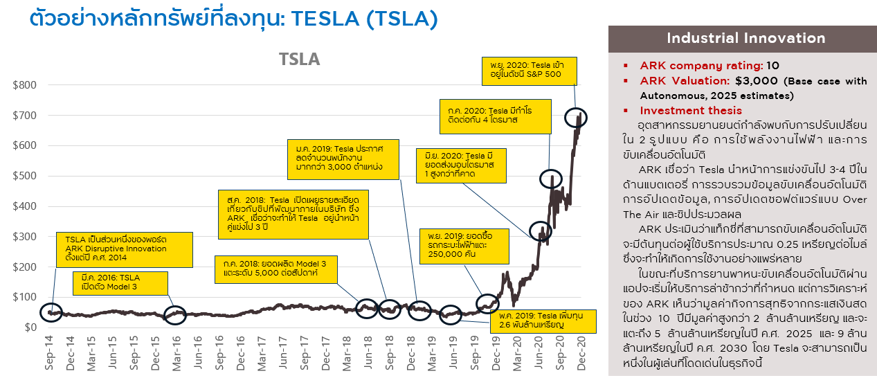 คุณ Catherine Wood กล่าวว่าแนวคิดการลงทุนแบบ “Disruptive Innovation” คือ ความเชื่อมั่นว่านวัตกรรมจะนำมาซึ่งการเปลี่ยนแปลงและกำหนดรูปแบบของสังคมในอนาคต ปรากฎการณ์เช่นนี้คล้ายคลึงกับช่วงต้น ค.ศ. 1900s ที่มีการสร้างสรรค์นวัตกรรมใหม่ๆ อย่างโทรศัพท์ รถยนต์ และไฟฟ้า นำมาซึ่งความเปลี่ยนแปลงไปทั่วโลกโดยสิ้นเชิง สำหรับในปัจจุบันก็เช่นเดียวกัน นวัตกรรมก็จะมีส่วนสำคัญในการเปลี่ยนแปลงที่ดีของอุตสาหกรรม ชีวิตความเป็นอยู่ของผู้คนและสังคมทำให้โลกนี้น่าอยู่ขึ้น ที่มา: ARK Invest, Nikko AM ณ ม.ค. 64