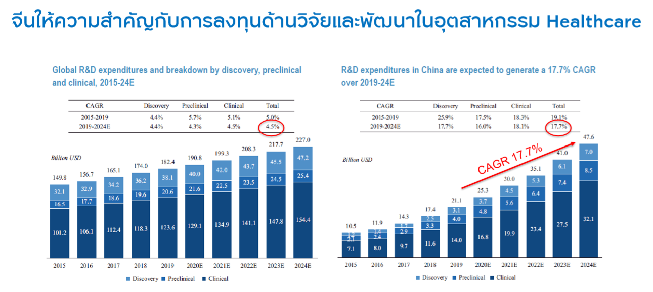 3) เทรนด์สินค้าและบริการด้านสุขภาพ จากโครงสร้างประชากรผู้สูงอายุที่เพิ่มมากขึ้น คาดว่าในปี 2568 จีนจะมีประชากรผู้สูงอายุมากถึง 1 ใน 5 ของประชากรทั้งหมด ซึ่งรัฐบาลจีนมองว่าเป็นปัจจัยเร่งด่วนให้รัฐบาลหันมาใส่ใจการพัฒนา และแก้ปัญหาด้านสาธารณสุขซึ่งจะสร้างโอกาสการเติบโตให้กลุ่ม Healthcare และ Health Tech ทั้งนี้ ตลอด 5 ปีที่ผ่านมา ตลาด Healthcare ของจีนมีอัตราการเติบโตสูงที่สุดในโลก เฉลี่ยถึง 11% ต่อปี มากกว่าสหรัฐซึ่งเติบโตเพียง 4% ต่อปีแต่การใช้จ่ายเพื่อสุขภาพของจีนยังคงต่ำกว่าในสหรัฐฯ (ที่มา: WHO ณ 7 เม.ย. 63 และ KraneShares) จึงยังมีโอกาสเติบโตได้อีกมากจากการเข้าสู่สังคมผู้สูงอายุ สำหรับการลงทุนในกลุ่มนี้ จะลงทุนในกองทุน Krane Share MSCI World Healthcare Index ETF ด้วยสัดส่วน 10% ของพอร์ต