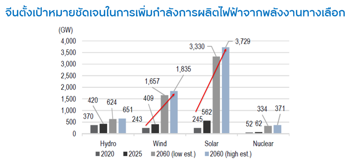 4) เทรนด์ด้านพลังงานสะอาด รัฐบาลจีนเน้นให้ความสำคัญด้านสิ่งแวดล้อมเป็นเป้าหมายสำคัญควบคู่กับการพัฒนาเศรษฐกิจระยะยาว โดยมุ่งที่จะให้จีนเป็นประเทศปลอดคาร์บอนภายในปี พ.ศ. 2603 และแผนงานที่สอดคล้องกับเป้าหมายดังกล่าว ได้แก่ การตั้งคณะกรรมการยุทธศาสตร์ด้านพลังงาน การลงทุนเพื่อการปฏิรูปพลังงานของประเทศ โดยตั้งเป้าจะเพิ่มกำลังการผลิตพลังงานทดแทน เช่น พลังงานแสงอาทิตย์ พลังงานลม เพิ่มขึ้น 145% ภายในปี 2573