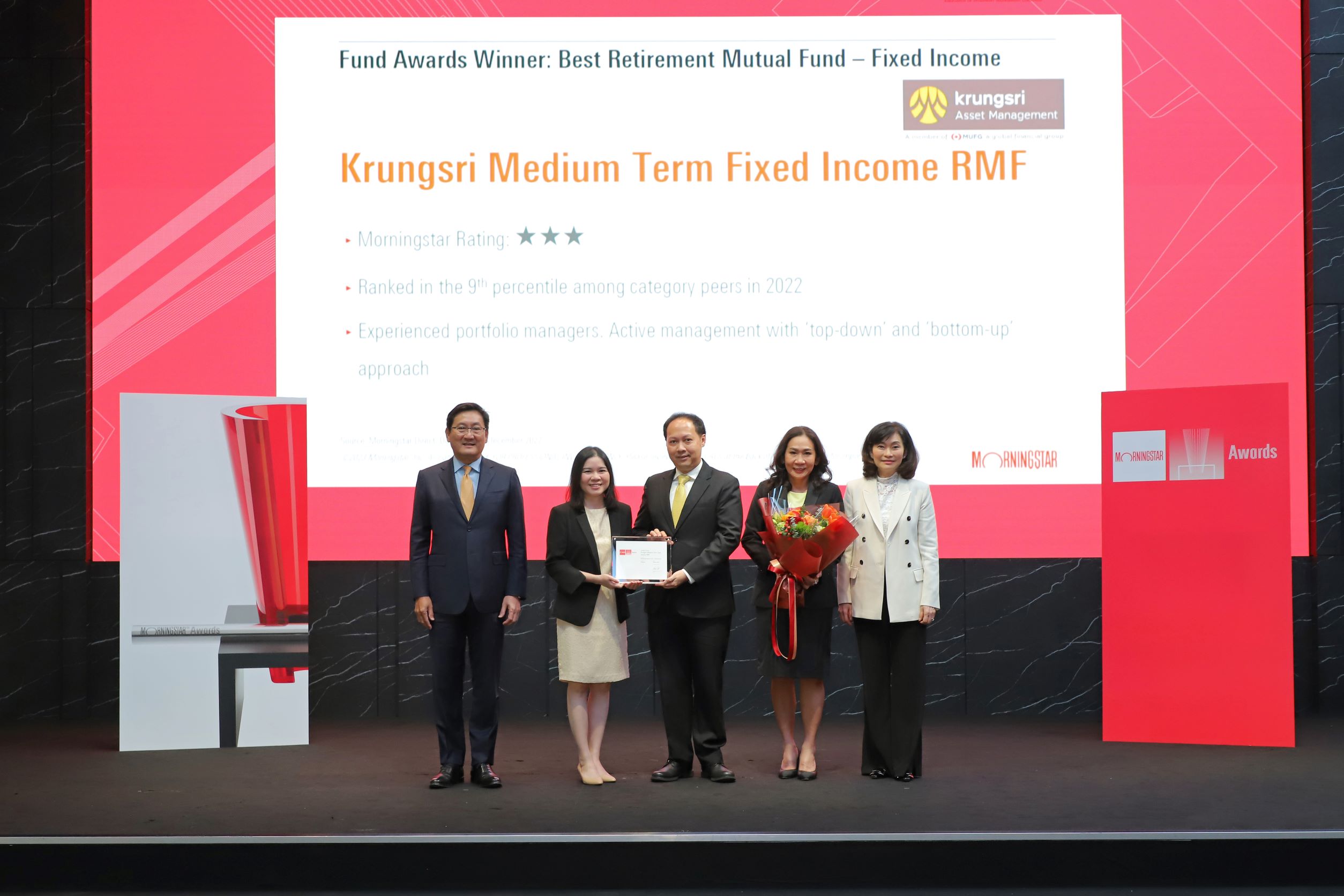 บริษัทหลักทรัพย์จัดการกองทุน กรุงศรี จำกัด นำโดยคุณสุภาพร ลีนะบรรจง กรรมการผู้จัดการ คุณศิระ คล่องวิชา ประธานเจ้าหน้าที่กลุ่มการลงทุน และคุณพรทิพา หนึ่งน้ำใจ ประธานเจ้าหน้าที่ฝ่ายการลงทุนตราสารหนี้ รับรางวัลกองทุนรวมเพื่อการเลี้ยงชีพยอดเยี่ยมปี 2023 ประเภทตราสารหนี้ จากมอร์นิ่งสตาร์ สำหรับกองทุนเปิดกรุงศรีตราสารหนี้ระยะกลางเพื่อการเลี้ยงชีพ (KFMTFIRMF) ซึ่งลงทุนในตราสารหนี้ภาครัฐ บริษัทเอกชน และเงินฝากธนาคารในประเทศ เหมาะสำหรับผู้ที่วางแผนเกษียณและไม่ต้องการรับความเสี่ยงสูง