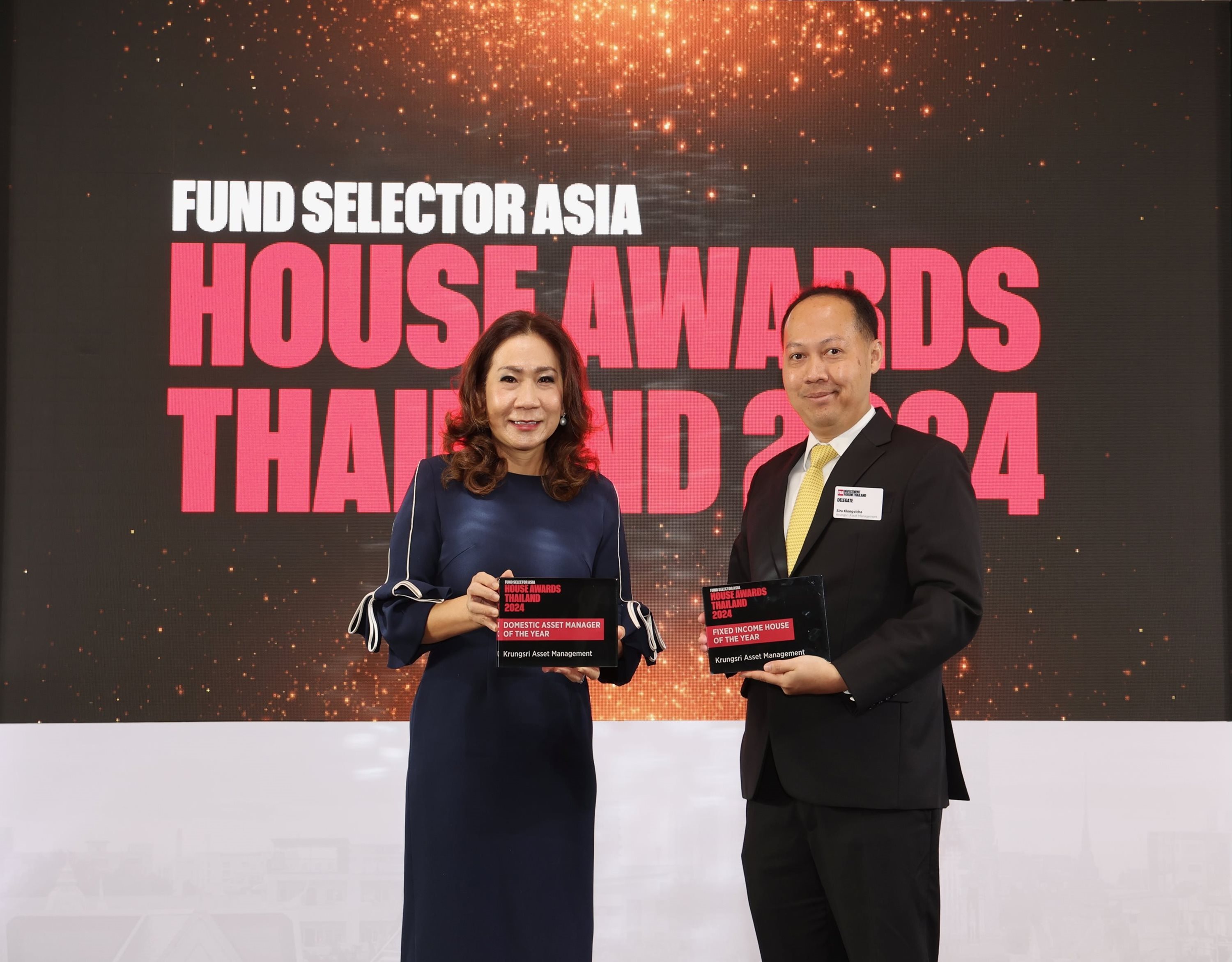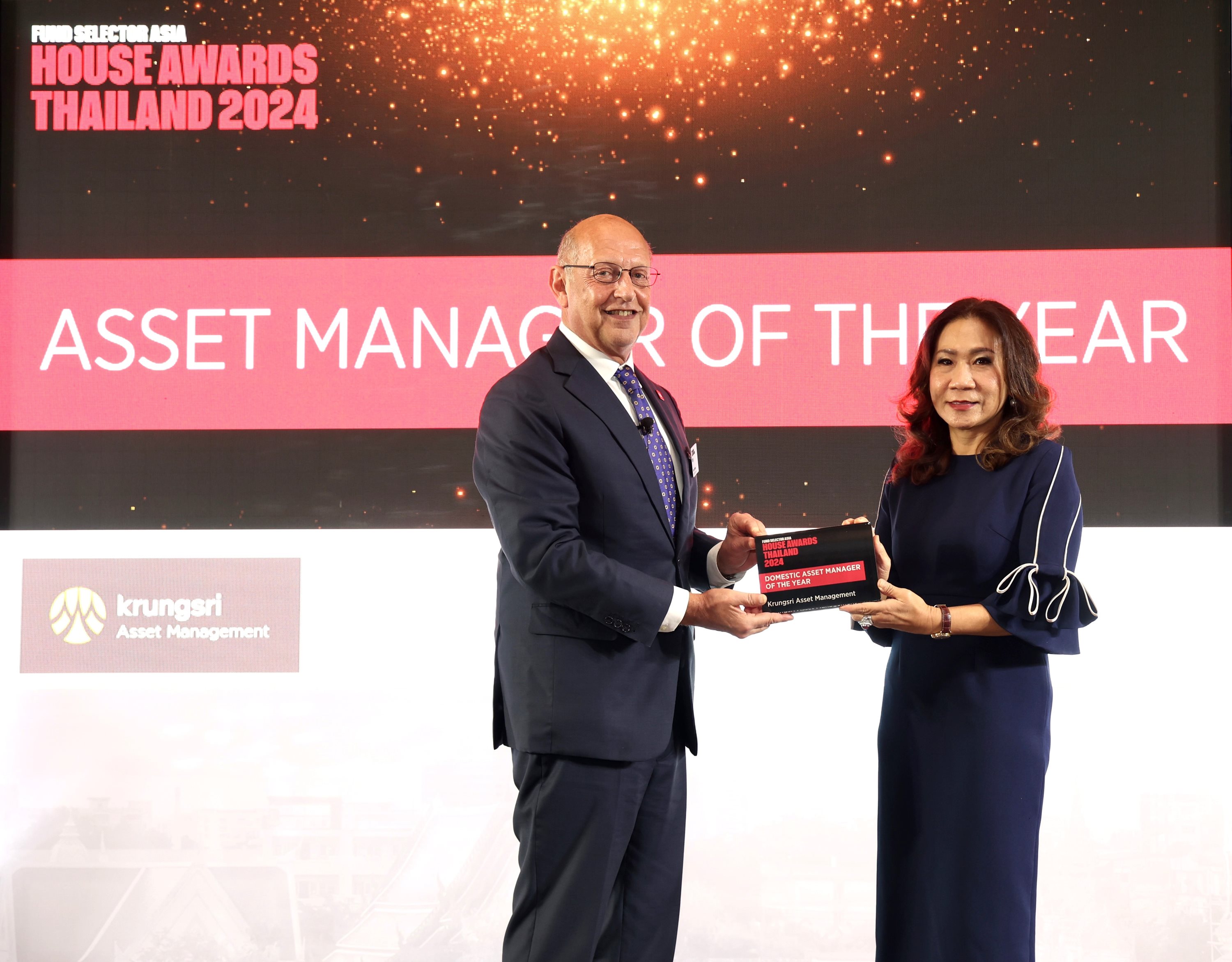 คุณสุภาพร ลีนะบรรจง กรรมการผู้จัดการ และ คุณศิระ คล่องวิชา ประธานเจ้าหน้าที่กลุ่มการลงทุน บลจ.กรุงศรี จำกัด เข้ารับรางวัล Asset Manager of the Year และ Fixed Income House of the Year ประจำปี 2567 จาก Fund Selector Asia (FSA) นิตยสารด้านธุรกิจและการเงินชั้นนำแห่งฮ่องกง โดยมี Mr. Rupert Walker, Regional Editor มอบรางวัลที่งาน FSA Investment Forum Thailand 2024 โดย บลจ.กรุงศรี ได้รับรางวัลจากการที่บริษัทมีผลการดำเนินงานและการเติบโตที่โดดเด่นของธุรกิจกองทุนโดยรวมและกลุ่มกองทุนตราสารหนี้ รวมทั้งกระบวนการลงทุนที่แตกต่าง และการนำเสนอผลิตภัณฑ์ใหม่ที่น่าสนใจ
