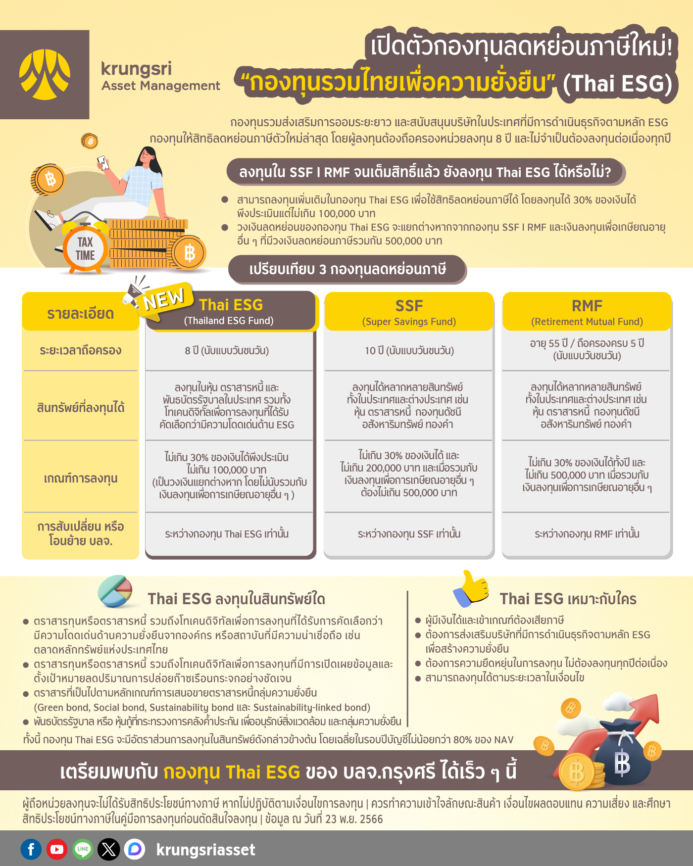 บลจ.กรุงศรี พร้อมเสนอขาย กองทุนรวมไทยเพื่อความยั่งยืน หรือ ThaiESG Fund กองทุนลดหย่อนภาษีรูปแบบใหม่ เพื่อให้นักลงทุนได้เตรียมวางแผนภาษีอย่างคุ้มค่า ด้วยวงเงินใช้สิทธิ์ลดหย่อนแยกจาก SSF/RMF พร้อมนโยบายการลงทุนในตราสารที่โดดเด่นด้านความยั่งยืน เพื่อโอกาสรับผลตอบแทนที่ดีอย่างยั่งยืนในอนาคต