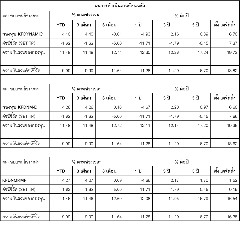 - KFDYNAMIC / KFDNM-D / KFDNMRMF มีนโยบายลงทุนในตราสารทุนในประเทศโดยเฉลี่ยในรอบปีบัญชี ไม่น้อยกว่า 80% ของ NAV โดยเน้นลงทุนในหุ้นที่มีปัจจัยพื้นฐานดีและมีแนวโน้มเติบโตในอัตราสูง | ระดับความเสี่ยง 6: เสี่ยงสูง