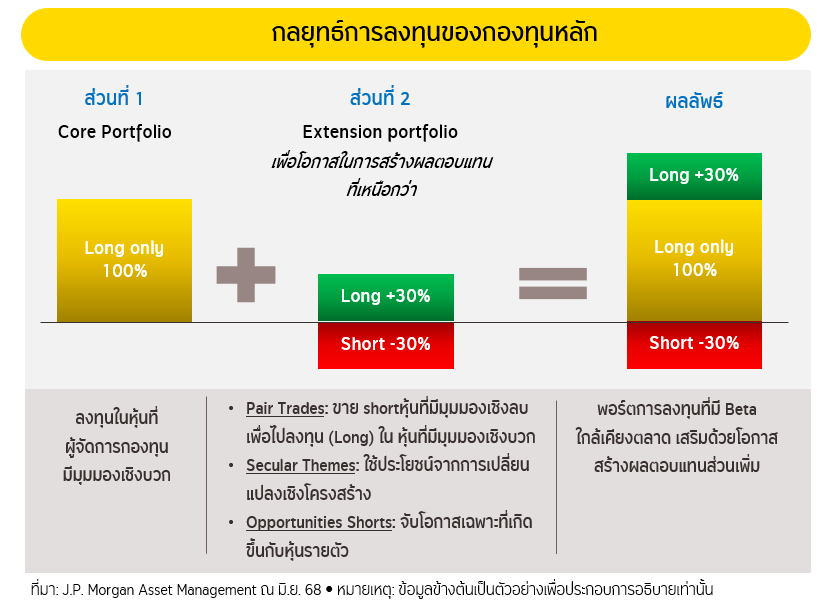 - มุ่งสร้างผลตอบแทนเหนือดัชนีภายใต้ความผันผวนใกล้เคียงตลาด แตกต่างจาก Active Fund ทั่วไป ด้วยพอร์ตหลักที่เน้นลงทุนที่หุ้นที่เชื่อมั่น และพอร์ตเสริมที่ใช้ทั้งกลยุทธ์ Long และ Short ของหุ้นที่คัดเลือกในแต่ละอุตสาหกรรม