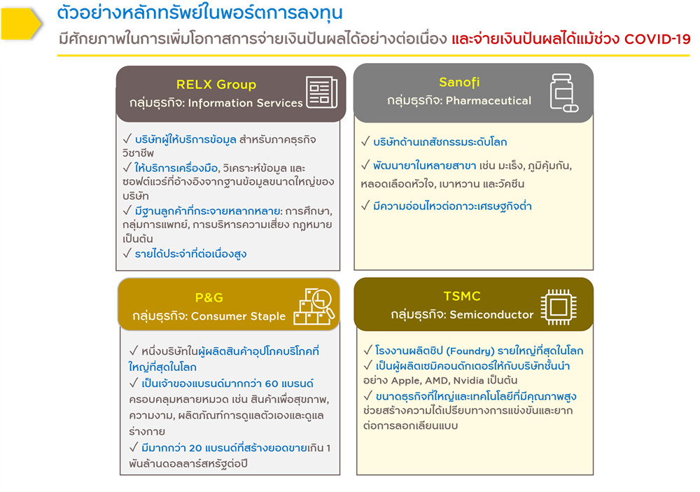 - หุ้นปันผลคุณภาพดีซึ่งมีลักษณะในเชิงรับ สามารถช่วยลดความเสี่ยงให้กับพอร์ตโดยรวมได้ ท่ามกลางความไม่แน่นอนในปัจจุบัน