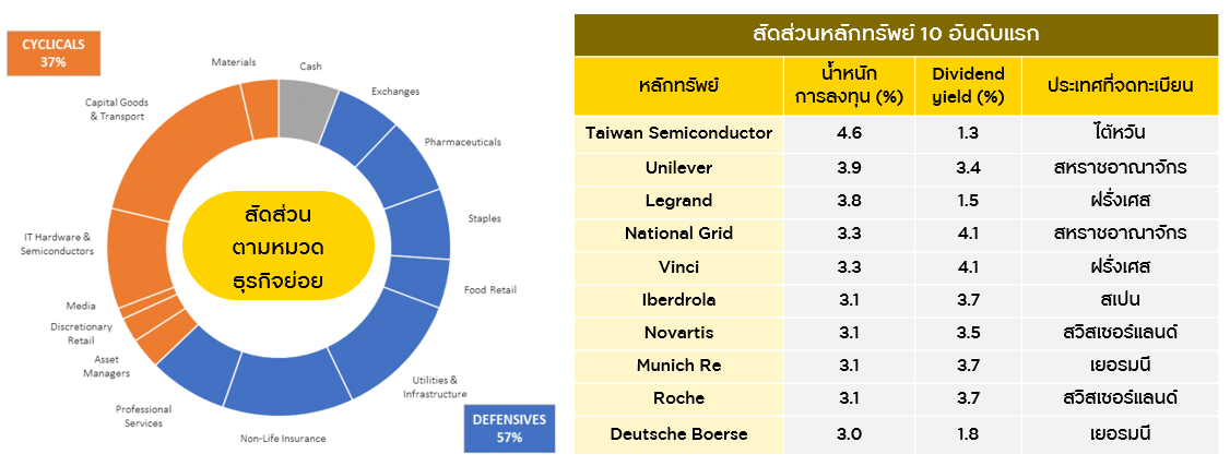 - พอร์ตการลงทุนที่ยืดหยุ่น ผสมผสานแนวทางการลงทุนในเชิงรุกและเชิงรับ ซึ่งประกอบไปด้วยหลักทรัพย์ที่มีศักยภาพการจ่ายเงินปันผลที่ดี พร้อมการกระจายการลงทุนอย่างหลากหลายทั่วโลก ไม่ยึดติดกับดัชนีชี้วัด อีกทั้งยังมีการลงทุนบางส่วนในหุ้นวัฏจักรคุณภาพดีเพื่อเพิ่มโอกาสการเติบโต ควบคู่กับการให้ความสำคัญกับการรักษาเงินลงทุนและจำกัดการขาดทุนตามแนวทางเชิงรับ (Defensive)