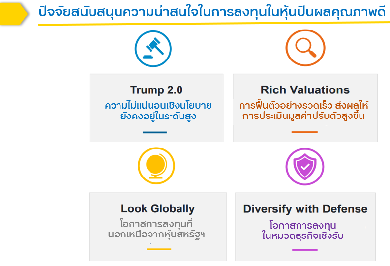 - โอกาสสร้างความแข็งแกร่งให้กับพอร์ตการลงทุน ท่ามกลางการเปลี่ยนแปลงของระเบียบโลก เป็นโอกาสการลงทุนที่กระจายวงกว้างไปสู่กลุ่มสินทรัพย์และภูมิภาคอื่นๆ มากขึ้น ช่วยกระจายความเสี่ยงการลงทุนนอกสหรัฐฯ