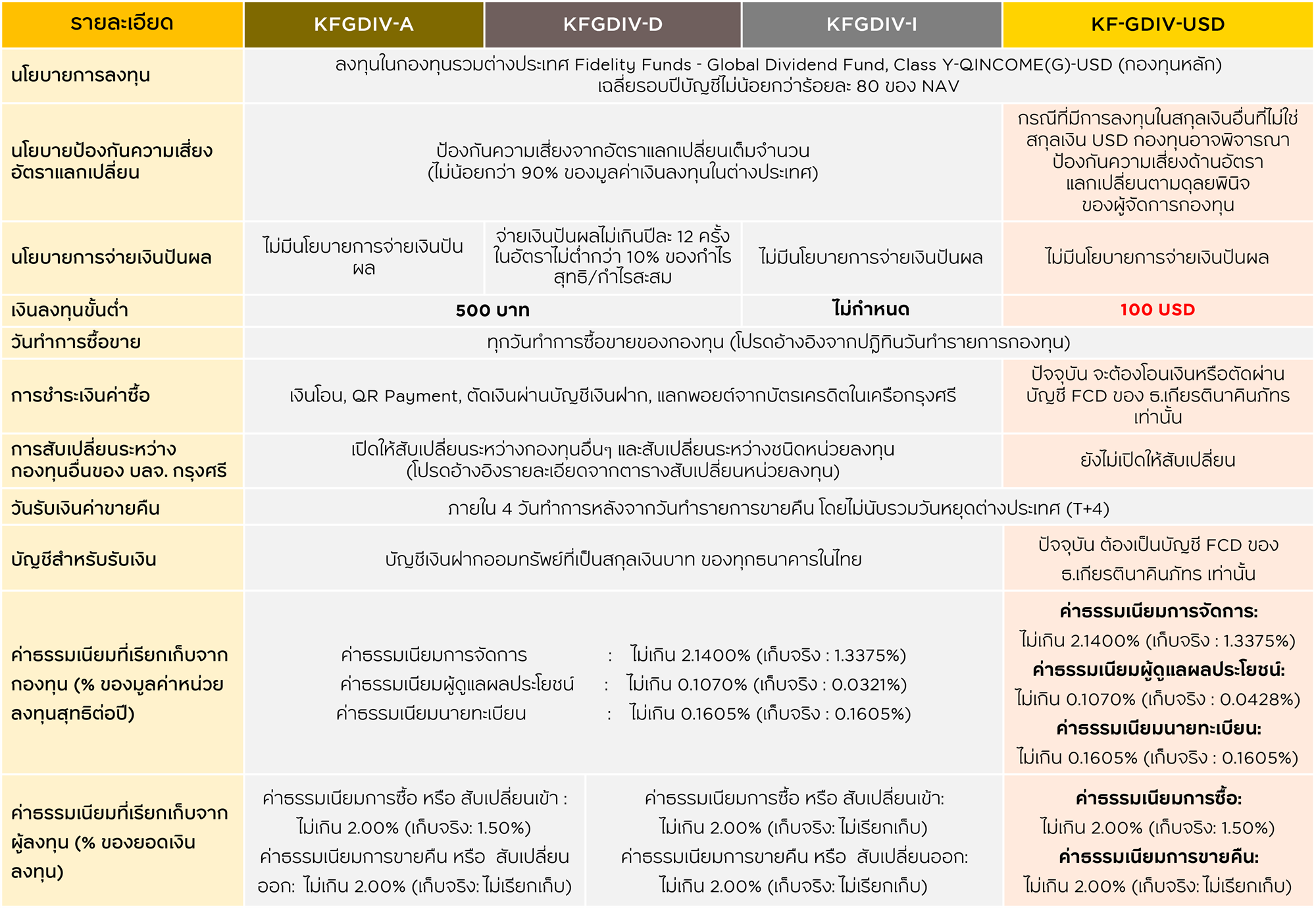 - ยกเว้นค่าธรรมเนียมการสับเปลี่ยนระหว่างชนิดหน่วยลงทุน KFGDIV-A, KFGDIV-D และ KFGDIV-I