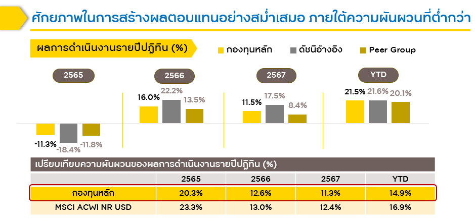 - ในช่วงปี 2566-2568 แม้จะเป็นช่วงที่ตลาดให้ความสนใจกับกลุ่มหุ้นที่ได้รับประโยชน์จาก AI โดยเฉพาะหุ้นเทคโนโลยีและกลุ่ม Magnificent 7 ทว่ากองทุนก็ยังสามารถสร้างผลตอบแทนที่เป็นบวกได้ แม้จะไม่ได้เน้นการลงทุนในกลุ่มหุ้น Mag 7 หรือกลุ่มเทคโนโลยีเป็นหลัก