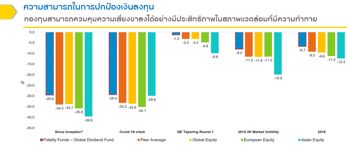 ที่มา: กราฟด้านบน: Fidelity International ณ 31 ต.ค. 68, Morningstar Direct ณ 12 ธ.ค. 68 | ผลการดำเนินงานของ Share class Y-QINCOME(G)-USD | ดัชนีอ้างอิง คือ MSCI ACWI NR USD | Peer group อ้างอิงจาก Morningstar EAA Fund Global Equity Income | กราฟด้านล่าง: Fidelity International, Morningstar Direct ณ 31 ต.ค. 68 | Since inception อ้างอิงจากวันจัดตั้ง Share class A-MINCOME(G)-USD ซึ่งเป็น Share class ที่จัดตั้งมานานที่สุด โดยจัดตั้งเมื่อ 30 ม.ค. 55 ในขณะที่กองทุน KF-GDIV-USD จะลงทุนใน Share class Y-QINCOME(G)-USD ซึ่งจัดตั้งขึ้นเมื่อ 20 ก.พ. 60 โดยมีนโยบายการลงทุนเหมือนกัน | Covid-19 crisis หมายถึงช่วง 19 ก.พ. - 30 มี.ค. 63 | QE tapering round 1 หมายถึงช่วง 1 พ.ค. – 30 มิ.ย. 56 | 2015 2H market volatility หมายถึงช่วง 1 มิ.ย. – 31 ธ.ค. 58 | 2018 หมายถึง 1 ม.ค. – 31 ธ.ค. 61 | Global Equity อ้างอิงจาก MSCI AC World NR index | European Equity อ้างอิงจาก MSCI Europe NR index | Asian Equity อ้างอิงจาก MSCI AC Asia Pacific ex Japan NR index | Peer Average อ้างอิงจาก Morningstar EAA Fund Global Equity Income | ผลตอบแทนวัดจาก NAV-NAV (ไม่รวมค่าธรรมเนียมขาเข้า) ในรูปสกุลเงิน USD | ผลการดำเนินงานที่แสดงเป็นผลการดำเนินงานของกองทุนหลัก ซึ่งไม่ได้เป็นไปตามมาตรฐานการวัดผลการดำเนินงานของกองทุนรวมของสมาคมบริษัทจัดการลงทุนข้อมูลกองทุน KF-GDIV-USD / สรุป Series กองทุนที่ลงทุนผ่าน Fidelity Funds - Global Dividend