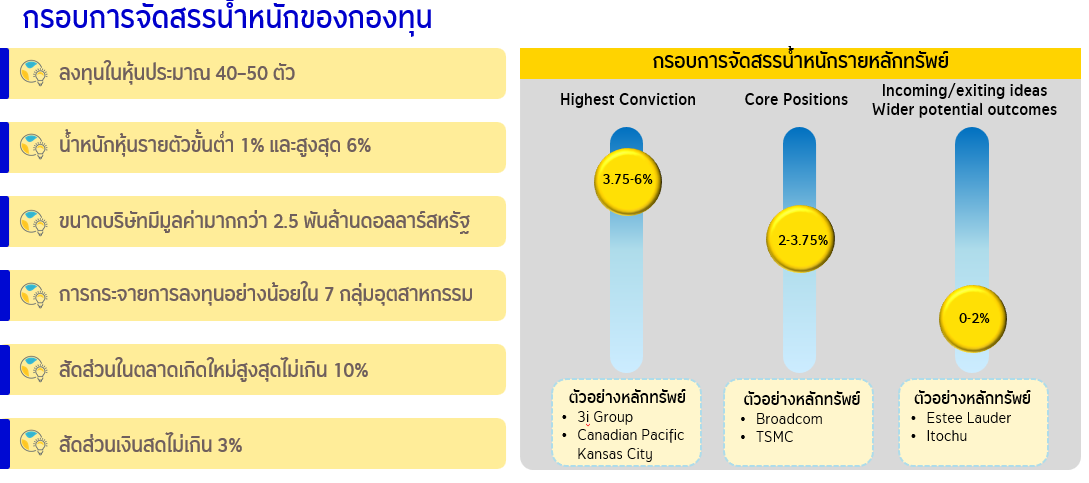 - บริหารอย่าง Active ให้ความสำคัญทั้งด้านกระแสเงินสดและการเติบโตของเงินลงทุน โดยเน้นการคัดเลือกหุ้นจากการวิเคราะห์ปัจจัยพื้นฐานที่เข้มข้น และให้น้ำหนักสูงในหุ้นที่ผู้จัดการกองทุนมีความเชื่อมั่น ไม่จำกัดเฉพาะหุ้นที่ให้ผลตอบแทนจากเงินปันผลเท่านั้น แต่ยังเปิดรับโอกาสเติบโตจากทั้งหุ้นเติบโตและหุ้นคุณค่า ส่งผลให้โครงสร้างพอร์ตมีลักษณะสมดุล (Balanced) เหมาะกับการถือเป็นสินทรัพย์หลักในพอร์ตหุ้น