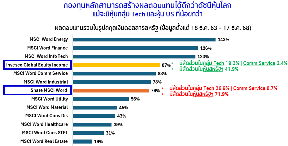2) ศักยภาพในการสร้างผลตอบแทนได้ดีกว่าดัชนีหุ้นโลก แม้จะมีหุ้นกลุ่มเทคโนโลยีและหุ้นสหรัฐฯที่น้อยกว่า