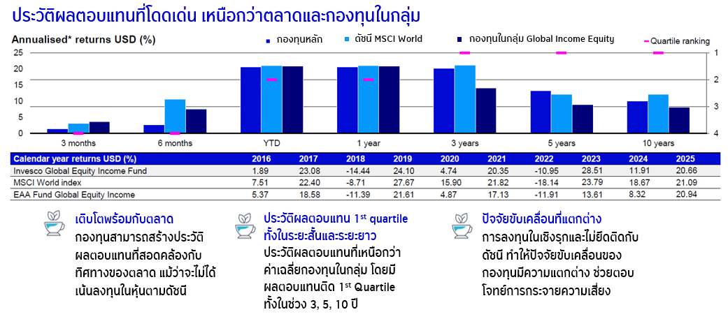 ที่มา: Invesco ณ 31 ธ.ค. 68 | *ผลตอบแทนของช่วงเวลามากกว่าหนึ่งปีเป็นการคำนวณในรูปแบบผลตอบแทนเฉลี่ยต่อปี (annualised) | ข้อมูลกองทุนในกลุ่มอ้างอิงจากการจัดกลุ่มของ Morningstar ในกลุ่ม EAA Fund Global Equity Income | ผลตอบแทนที่แสดงเป็นผลตอบแทนสุทธิหลังหักค่าธรรมเนียมการจัดการและการทำธุรกรรมต่างๆ แสดงในรูปสกุลเงินสหรัฐ | ผลการดำเนินงานที่แสดงเป็นผลการดำเนินงานของหน่วยลงทุนประเภท Z Share Class ซึ่งเสนอขายเฉพาะผู้ลงทุนที่มีคุณสมบัติตามที่กำหนดในประเทศที่ได้รับการรับรองเท่านั้น ในขณะที่กองทุน KF-GEI จะลงทุนในหน่วยลงทุนประเภท C (Acc) share class ซึ่งทั้งสองหน่วยลงทุนมีกลยุทธ์การลงทุนเดียวกัน | ผลตอบแทนที่แสดงเป็นผลตอบแทนสุทธิหลังหักค่าธรรมเนียมการจัดการ โดยนำเงินปันผลรวมกลับคำนวณในผลตอบแทน | ผลการดำเนินงานที่แสดงเป็นผลการดำเนินงานของกองทุนหลัก ซึ่งไม่ได้เป็นไปตามมาตรฐานการวัดผลการดำเนินงานของกองทุนรวมของสมาคมบริษัทจัดการลงทุน